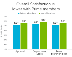 In all three segments, Overall Satisfaction scores are 4 ppts lower for Prime members. This could be due to the fact that these customers are used to the benefits of the Amazon experience, and their expectations are higher. Brands need to make a more concerted effort to improve the in-store experience in order to impress this rising group of consumers.