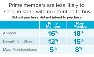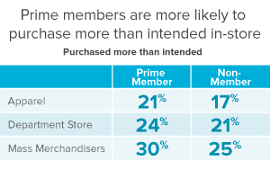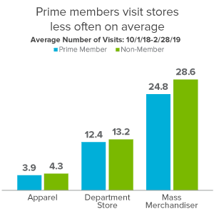 With unlimited 2-day shipping, it makes sense that Prime members have fewer in-store visits. But there is a huge opportunity for brands to make an impression on these customers when they shop in-store, especially in the mass merchandiser segment.