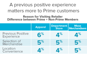 So if you know Prime customers tend to buy more than intended during in-store visits, the question becomes: how do you get them to visit more frequently? The answer is to provide them with a positive experience. Prime customers are 6 ppts more likely to cite a previous positive experience as their primary reason for visiting a brand’s location. Again, their expectations are higher, but if you impress them, they'll come back.